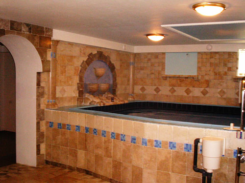 Облицовка из натурального камня и мозаичные вставки На небольшой площади в загородном доме обустроена сауна и бассейн. Полы и стены помещения бассейна и комнаты отдыха выложены плиткой из натурального камня (травертин). Уникальные рисунки каждой плитки в целом образуют естественно выглядящую поверхность теплых, мягких бежевых тонов с оттенками охры. Дополнительные элементы из более темного камня с коричневыми и красными оттенками создают контрастные линии и подчеркивают общее настроение спокойствия и расслабленности.