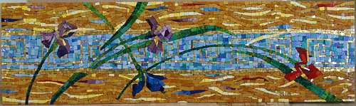 Мозаичный бордюр «Ирисы» Тонкий, изысканный рисунок ярких цветков и насыщенно зеленой травы, стеблей и листьев контрастно выделяется на фоне волнистого золотисто-желтого узора.