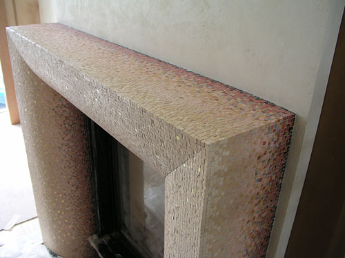 Мозаичная облицовка камина Для оформления представленного на фотографиях камина было выбрано мозаичное оформление из цветной смальты. Поверхность каминной рамы с помощью цветового градиента приобретает дополнительную глубину, оттенки теплой цветовой гаммы формируют визуальное представление бархатной, мягкой поверхности.
