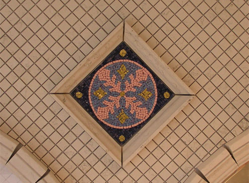 Декоративные ромбы с мозаичными вставками Облицовка стен помещения выполнена из природного камня - травертина теплого белого цвета. Оправа мозаики - из того же камня - рельефные рамы классического, багетного профиля. Рисунок мозаики - вписанный в ромб круг, на котором выложен контрастный флористический элемент.