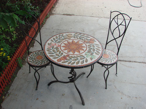 Комплект мебели с мозаикой из смальты Мозаичные розетки используются в качестве столешницы и стульев для сидений. Большая розетка - столешница - представляет собой классическую композицию из центрального ''солнечного'' элемента и обрамляющего центр венка, в который вплетены фрукты. Розетки на стульях представляют собой упрощенный вариант рисунка столешницы.