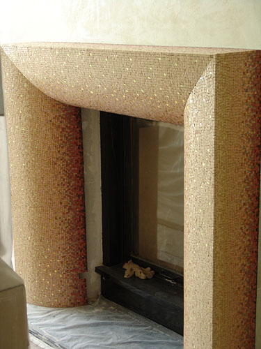 Мозаичная облицовка каминаКамин - важный элемент интерьера, который решает сразу комплекс функциональных и эмоциональных задач. Камин - это тепло, это возможность поддержания комфортной температуры в доме или помещении. Камин - это домашний очаг, подсознательное обращение к заложенныму веками восприятию места разведения огня как центра жилища, места сбора семьи, клана, сообщества. Камин - это важный элемент интерьера, оформление которого способно задать тон всей атмосфере дома, зала, комнаты. Для оформления представленного на фотографиях камина было выбрано мозаичное оформление из цветной смальты. Поверхность каминной рамы с помощью цветового градиента приобретает дополнительную глубину, оттенки теплой цветовой гаммы формируют визуальное представление бархатной, мягкой поверхности. Вкрапления золотой смальты создают блестки, которые в дневном и электрическом свете разбивают монотонность поверхности яркими бликами, а во время работы камина создают эффект разлетающихся искорок. Смальта не горит и устойчива к температурам, которые могут быть достигнуты в камине, поэтому такое покрытие является еще и гарантией пожарной безопасности. Материал: цветная и золотая смальта