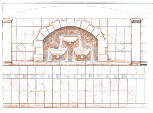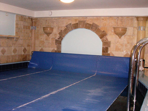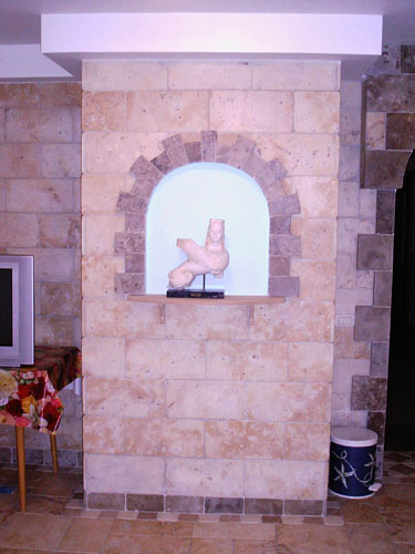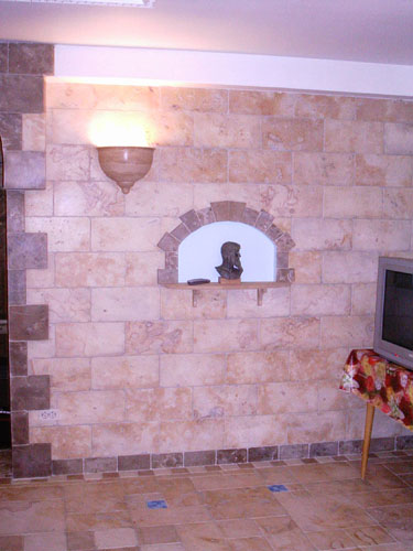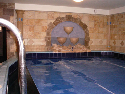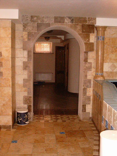 Облицовка из натурального камня и мозаичные вставкиНа небольшой площади в загородном доме обустроена сауна и бассейн. Полы и стены помещения бассейна и комнаты отдыха выложены плиткой из натурального камня (травертин). Уникальные рисунки каждой плитки в целом образуют естественно выглядящую поверхность теплых, мягких бежевых тонов с оттенками охры. Дополнительные элементы из более темного камня с коричневыми и красными оттенками создают контрастные линии и подчеркивают общее настроение спокойствия и расслабленности. Натуральный камень отлично справляется с выполнением функциональных задач облицивочного материала для помещения с большой влажностью. Проходная арка минимальных размеров украшена рельефными элементами, превращающими ее в изуально более значительный портал. Стены декорированы арочными элементами, повторяющими рисунок основной арки. На узких пристеночных полках размещены декоративные предметы, создающие атмосферу парадности, значимости, и превращающие утилитарное пространство в уютный уголок. Особая атмосфера римских терм, которые ассоциативно вспоминаются в связке "вода-чистота-бассейн-природный камень", подчеркивается оригинальными настенными плафонами светильников, также выполненными из натурального камня. По углам бассейна размещены полу- и четверть- колонны, также отсылающие к эпохе античности, но вместе с тем решающие задачу выделения в пространстве с невысоким потолком вертикалей, помогающих зрительно "приподнять" потолок помещения. Изысканность в интерьер вносят небольшие декоративные вставки из смальты ярко-синих и ярко-голубых цветов. Синий декор идет по бортику самого бассейна, повторяется в украшении колонн, а кое-где вмонтированные в пол синие декоры создают впечатление крошечных озер воды. Пол также украшен ковром-мозаикой из простых типовых геометрических элементов. В наборе использован натуральный камень четырех оттенков, прекрасно сочетающихся друг с другом. В размерах квадратных элементов, вокруг которых строится узорный орнамент, учтены пропорции золотого сечения, а весь ковер при кажущейся простоте становится важным элементом общего интерьера, создавая эффект нарядности, торжественности.