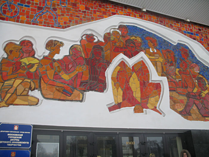 Панно на фасаде Дворца пионеров Ленин, солнце, пионерская песня у костра, посадка деревца - расхожие символы-штампы, традиционный красный цвет в сочетании с оранжевым и белым, контурные рисунки, и всё вместе - один из блестящих образцов мега-мозаик Страны Советов. Мозаика набрана из цельных заготовок смальты производства мастерских Российской Академии Художеств. Расчёт строился на восприятие издалека, на постепенное приближение к зданию.