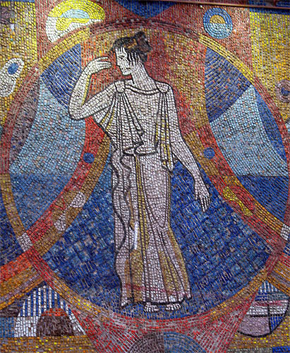 Мозаичное панно «Женская мода» В центре композиции - круг, в который заключена фигура женщины в древне-греческой тунике и с причёской, напоминающей известные по скульптурам античные образцы укладки волос. Вокруг круга расположены ещё четыре персонажа, которые символизируют различные эпохи костюмных предпочтений. При всей условности изображения одежд, они всё же узнаваемы.