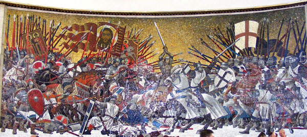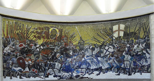 Диагональное построение композиции продиктовано мотивом противостояния: клин (или «свинья», как называли его у нас) псов-рыцарей врубается в русское воинство, останавливается и сминается им. Динамику сюжета подчеркивают линии копий в руках сражающихся: у немцев они черные — несущие порабощение, смерть; у ратников Невского-красные, как бы раскалены от ярости к противнику. Центральный образ — Александра Невского. Собственно, композиция замышлена так, чтобы он и выделялся на золотом фоне в единоборстве с закованным в железо магистром. Меч Невского-единственное белое пятно среди знамен и копий. Как молния сверкает оружие полководца, разящего врага. Центральная группа мозаики — своего рода аналогия с иконным образом Георгия Победоносца, попирающего дракона.